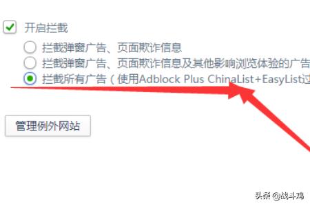 6、然后我们将其变更成所有广告均拦截,如下图所示,我们点击所有拦截保存即可。