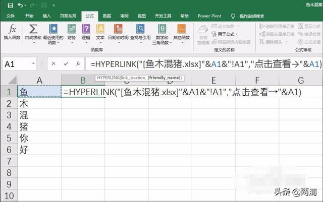 3、然后输入Hyperlink函数引导的公式,第一个参数为链接地址,要详细写清楚链接的路劲,这里虽然是链接当前工作簿中的工作表,也要完整地写清楚当前工作簿名字,另外,必须链接指定固定的某个单元格,如下图所示。