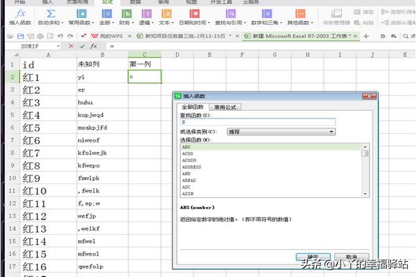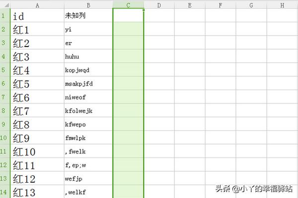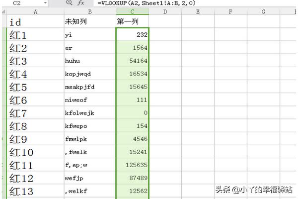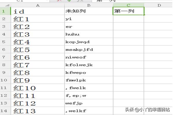 2、会发现这两个excel表格的A列是相同类型的,都是“id”,不同的是Sheet1有“第一列”,而Sheet2有“未知列”,现在就是需要把2个excel合并成一个表格。现在我想把Sheet1的“第一列”合到Sheet2的C列,先在C列写好标题“第一列”。如图。