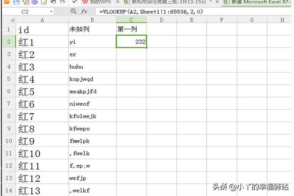 8、这时C列的C2显示232,表示红1“第一列”属性是232,因为刚才的函数公式是跟红1对应的,所以出现了红1的数据,如果想要其他的数据时,可以把鼠标放到C2选项框的右下角,等到出现一个小“+”号时,双击鼠标左键。(如下图)
