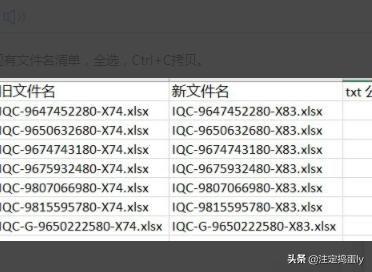 3、在Excel表格A1,B1,C1单元格分别输入“旧文件名”“新文件名”“txt公式”。这里举例的新旧文件名差别是X74 <=> X83。可以根据需要修改成任何新的文件名。