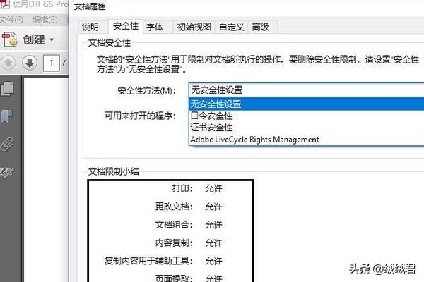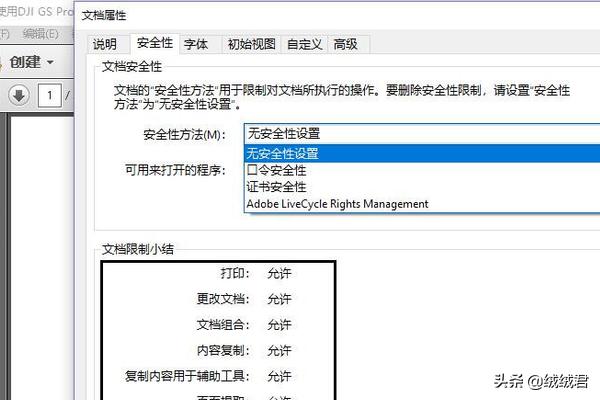 2、在文档属性对话框中可看到文档限制小结内显示均为允许,然后在安全性方法的下拉菜单中选择口令安全性。