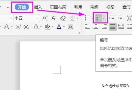 3、点击文档正上方导航栏“开始-编号▼”,进入“编号”设置界面。