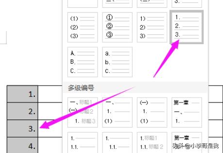 4、进入“编号”设置界面后,选择如下图箭头所指的“编号样式”,这个时候就会在选中表格中出现同样的样式。