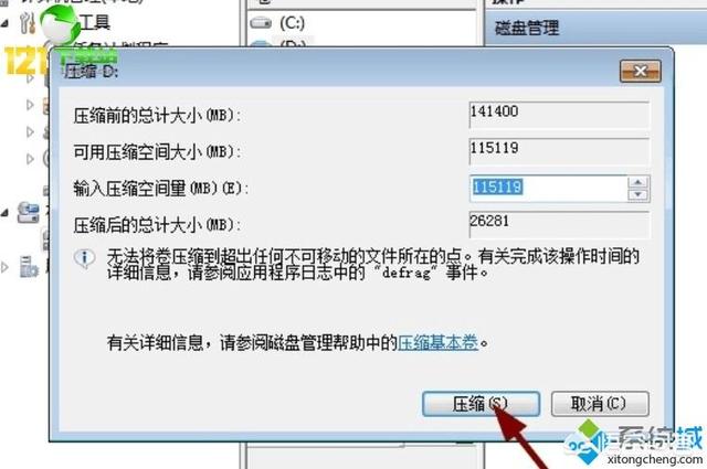 3.右键单击选择要压缩的磁盘(本例选择D盘),快捷方式选择“压缩卷”在输入压缩空间量(MB)里填写要压缩出的空间量,如果要压缩出50G,就填写50*1024=51200,选择"压缩"按钮;