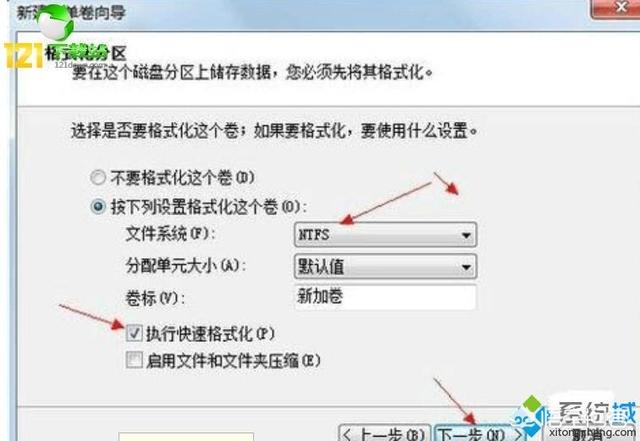 6、继续下一步选择文件系统和是否执行快速格式化或者文件压缩;