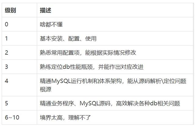 如果把MySQL水平定义成1~10级,下面是我对各种级别水平的理解。