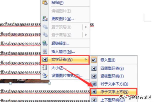 步骤七:然后选择“浮于文字上方”,使得图片浮在文字的上面,而不会被覆盖了。