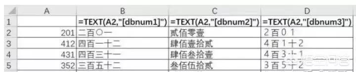 语法:TEXT(要转换的数值,格式参数)格式参数为"[dbnum1]":普通大写,如“二百五十九”;格式参数为"[dbnum2]":财务大写,如“柒佰捌拾”;格式参数为"[dbnum3]":阿拉伯数字+单位,如“2百4十9”;