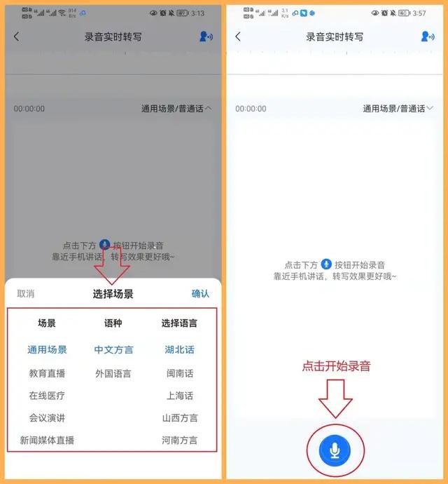 2、然后在下方选择适合的场景以及语种、语言,选择完成后,点击下方『开始录音』的话筒就可以实时转写文字。