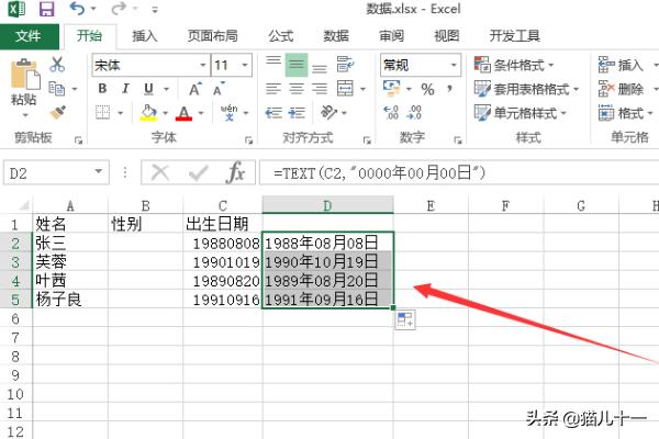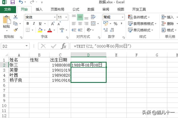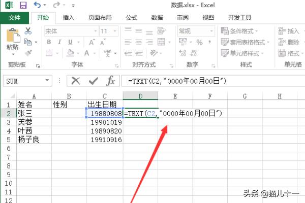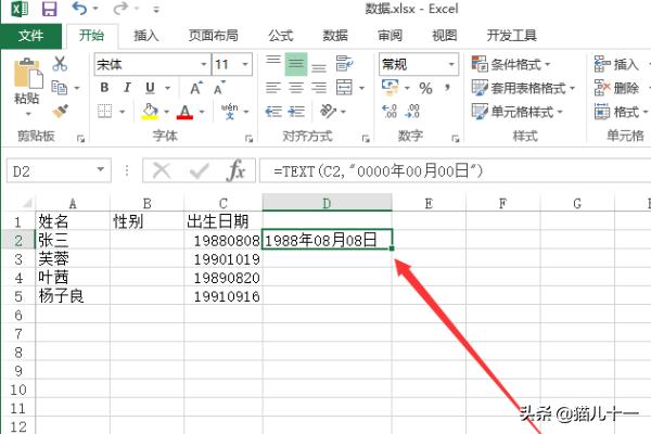 二、在D2单元格中输入公式“=TEXT(C2,"0000年00月00日")”。如图所示;