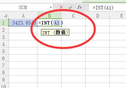 2、在B1单元格中输入公式:=INT(A1),此函数为取整函数。