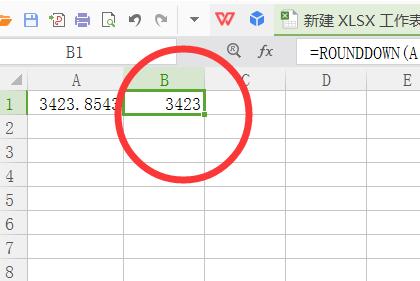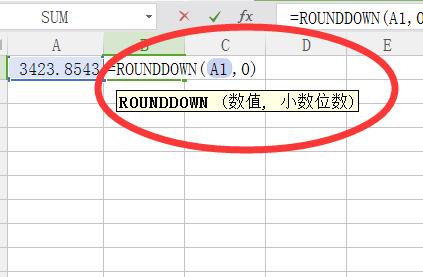 4、或者使用函数公式:=ROUNDDOWN(A1,0),意思为取A1单元格的数值,小数位数为“0”。