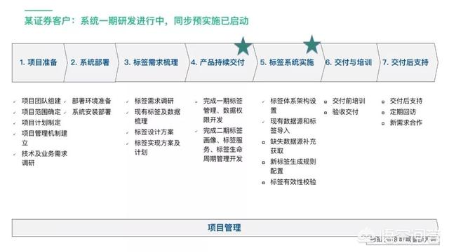 以上是一个神策标签画像产品的实施流程示意,如上图,可以发现,我们整体的项目管理做的非常精细,包括项目准备、系统部署、标签需求梳理、产品持续交付、标签系统实施、交付与培训、交付后支持七个步骤。