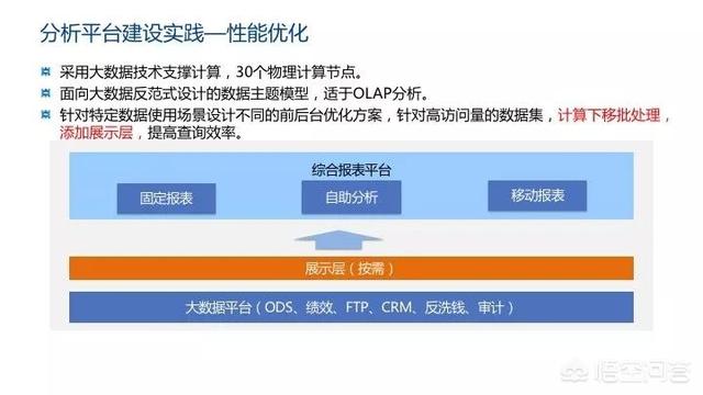 在前几年中原银行对分析平台做了一些性能调优。一般刚开始从报表转到 BI,肯定会面临性能问题,因为 BI 本身是一种以空间换取灵活性的方式。