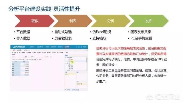 这些平台面向的人员有所不同,报表主要面向数据使用人员;自助分析主要面向条线,比如给领导编制报表和往下发布数据的人;数据实验室主要面向一些有科技背景的人员,比如建模师。