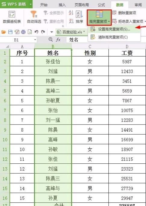 第二步:在菜单栏中选择“数据--高亮重复项--设置高亮重复项”。