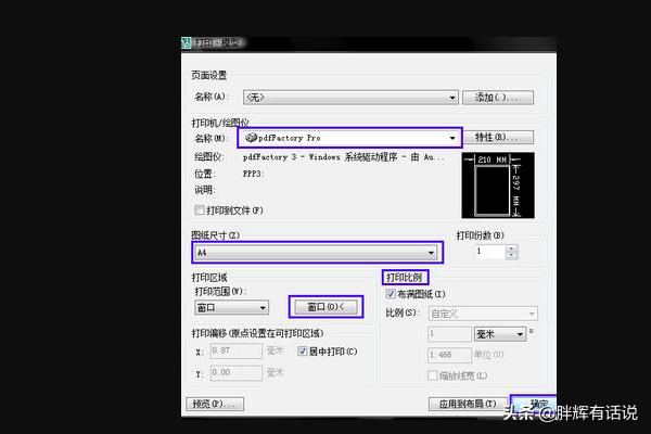 3、弹出打印界面,打印机一项选择好安装的PDF factory 打印机,然后根据你自己打印机图纸的习惯设置好其他项目,点击确定。