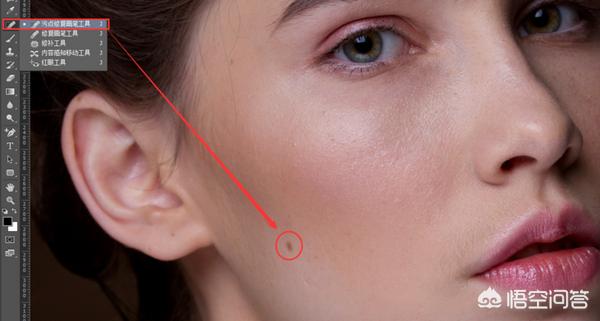 1、比较明显的痘痘可以先使用【污点修复画笔工具】,在左侧选择【污点修复画笔工具】,调整画笔大小,直接点击想修复的斑点,点击后斑点就消失了。