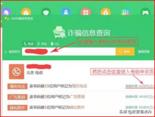 3、在这个页面,输入手机号码,查询号码被标注的情况,然后点击第二个箭头“360安全卫士”那里,打开手机号码申诉页面,如图所示。