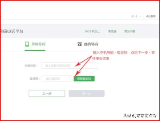 4、打开手机号码申诉页面后,填入被标注的手机号码,输入验证码,点击下一步,提交申诉,等待申诉结果。