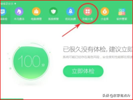 1、首先在电脑上打开360安全卫士,最上边第一排这里有个“功能大全”,点进去。