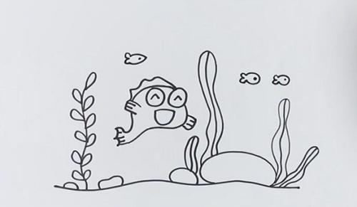 2 步骤二: 弧线画出飘动着的海草,在海草中间画出线条的装饰,接着用椭圆形画出大小不一的石头,大鱼的顶上有三个有过游动着的小鱼。