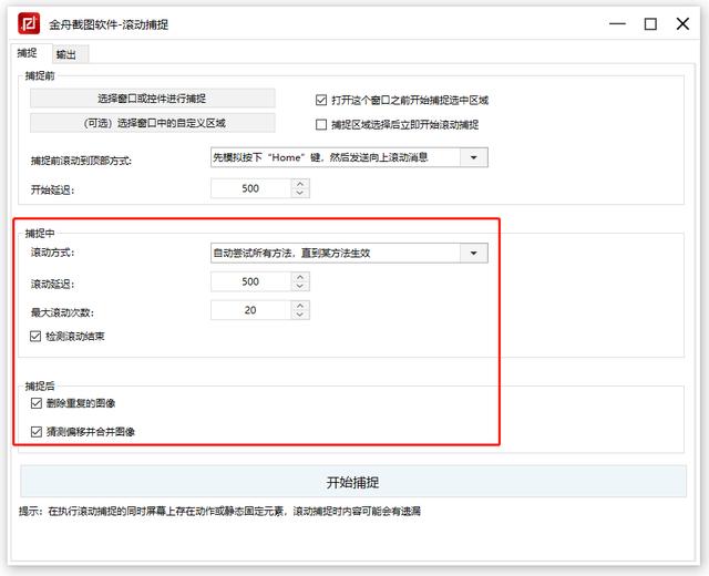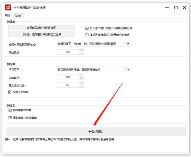 六、接下来,软件会自动帮你滚动式截图;完成后,在“输出”选项中,点击右上角的“根据捕捉设置保存”即可;