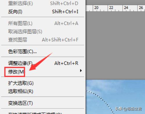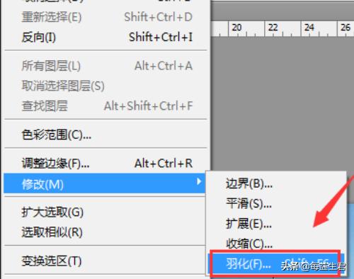 6、点击修改选项在,在其子级菜单里找到羽化选项,如图所示。