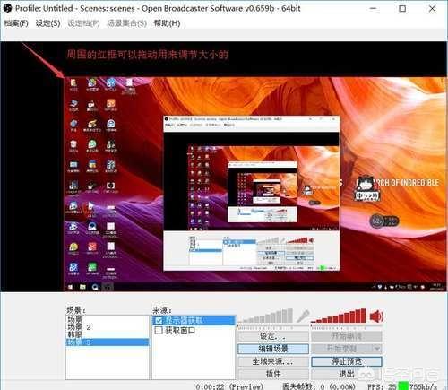 OBS可以直接在画面框里用鼠标调整素材的大小。 1)在OBS的主界面点击【预览串流】 2)再点击【编辑场景】 3)这时画面就出现了标识的红框,你就可以用鼠标那拖动了,如图: