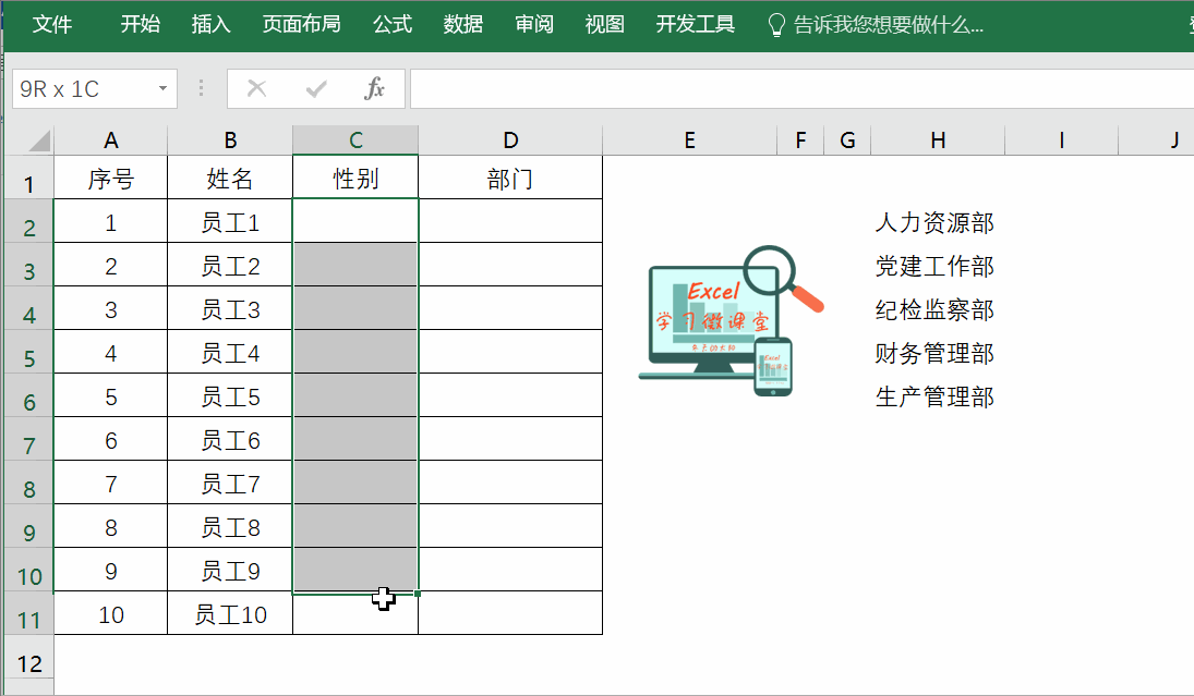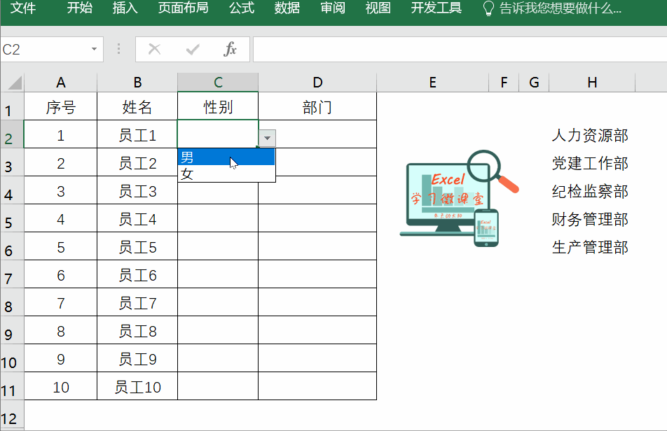制作步骤:选中录性别的C2:C11单元格区域→【数据】→【数据验证】→【允许】→【序列】→在【来源】处录入“男,女”,中间的逗号一定要用英文状态下的逗号→确定后即可。