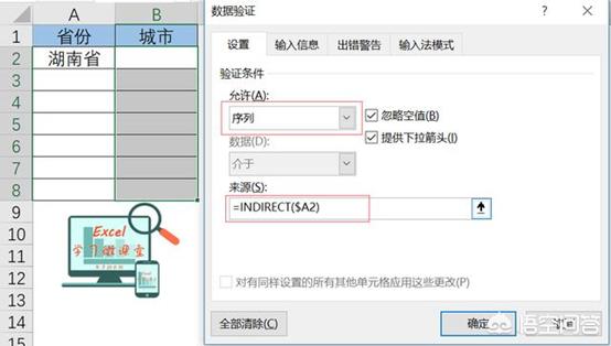 设置方法同一级菜单相似,只是来源不同,需要用到INDIRECT引用函数。选择B2:B8→【数据】→【数据验证】→验证条件选择【序列】→来源录入【=INDIRECT($A2)】→【确定】。