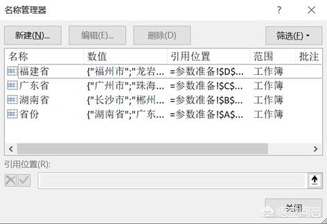 通过上述操作,将A3:A5定义为【省份】,将B3:B5定义为【湖南省】,将C3:C5定义为【广东省】,将D3:D5定义为【福建省】。名称定义好后,可以在名称管理器中看到已经定义好的名称。