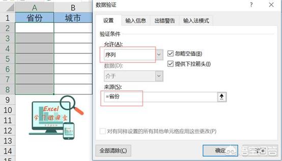 选择单元格A2:A8→【数据】→【数据验证】→验证条件选择【序列】→来源录入【=省份】→【确定】。