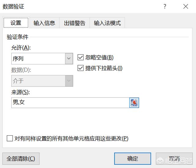 方法1:【来源】直接录入法。如效果图中C列的“男”和“女”两个选项的下拉列表