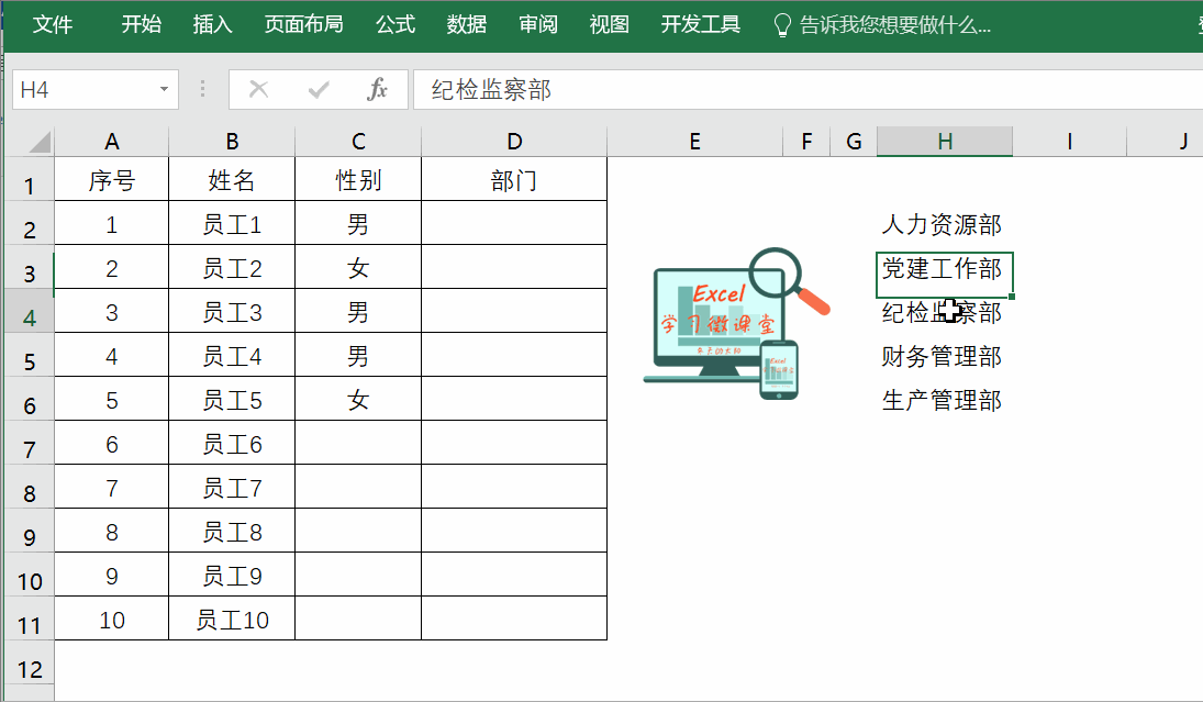 制作步骤:首先在其他区域H2:H6录入列表内容→选中录部门的D2:D11单元格区域→【数据】→【数据验证】→【允许】→【序列】→在【来源】右边的小箭头→选择来源区域为H2:H6→再点击右边的小箭头回到数验证对话框→确定即可。