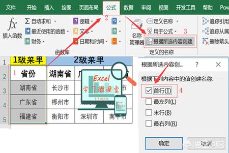 选择一级菜单A2:A5→【公式】→【根据所选内容创建】→选择【首行】→选择二级菜单B2:B5→按F4重复上一操作→选择二级菜单C2:C5→按F4重复上一操作→选择二级菜单D2:D5→按F4重复上一操作即可。