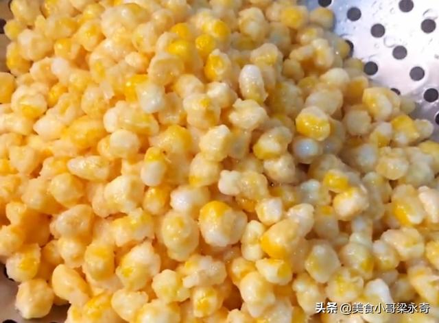 第一步,锅中倒入适量的清水,把新鲜的玉米粒倒入锅中煮熟,然后捞出玉米粒控干水分备用。