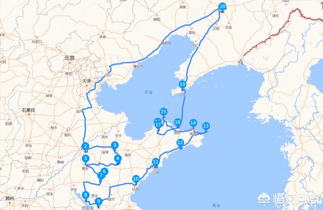 沈阳——锦州——秦皇岛——唐山——天津——沧州——济南——淄博——青州古城——沂山——沂源——莱芜——泰安——蒙阴——蒙山——曲阜——邹城——微山湖——枣庄——台儿庄——临沂——日照——青岛——乳山银滩——成山头——荣成——威海——蓬莱——长岛——龙口南山——招远罗山——栖霞——烟台——渤海轮渡——大连——沈阳,全程约3600公里,基本没有回头路。