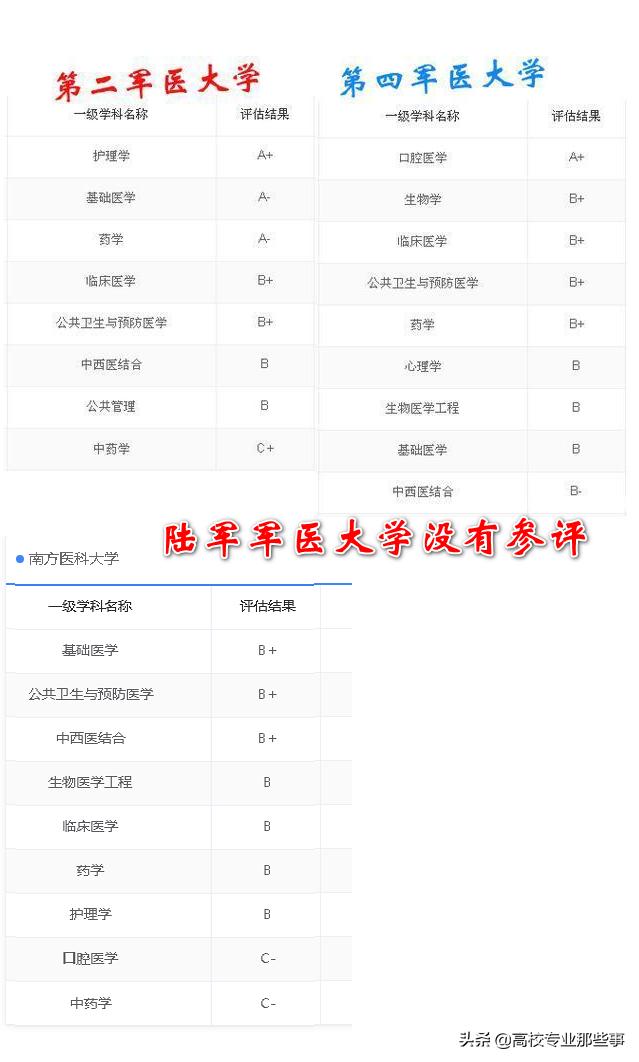 学科评估看,第二军医大学三个a类学科,不过都是非主流的护理、基础医学、药学。