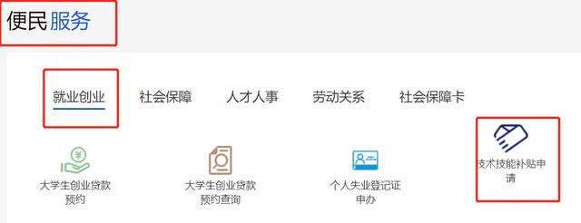 4、点击首页——便民服务——就业创业——技术技能补贴申请