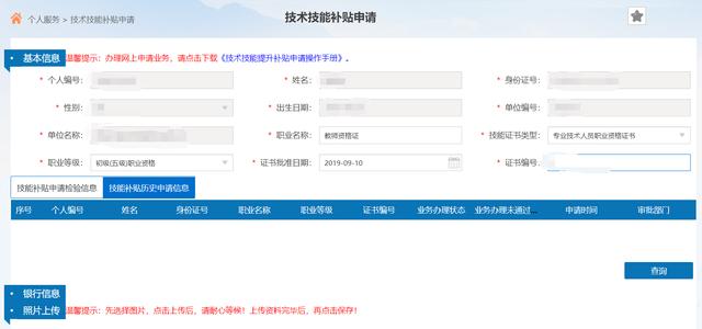 5、填写相关信息资料,包括证书核发日期、授予日期、证书类型等,完成后上传证书、身份证、银行卡正反面(注意:银行卡必须为西安银行卡,审批部门选择为西安市)。上传资料完成后,点击保存,完成申请