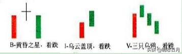 黄昏之星:中阳线、滞涨线和中阴线三根K线的组合,显示涨势向跌势变化,空方获得优势。
