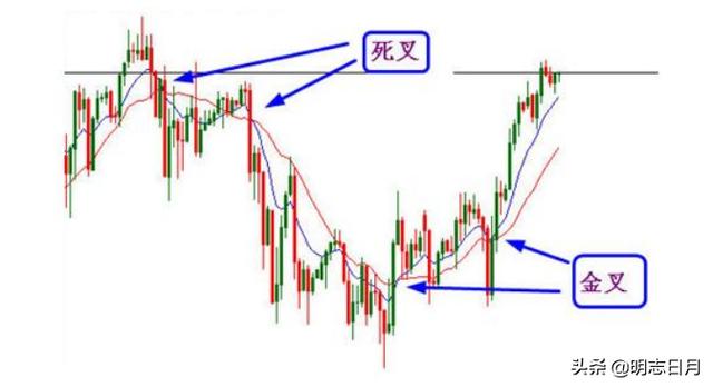 均线.MA)——是由单位时间内股价的在改单位时间内的平均值所得的点相互相连而成的曲线。一般有5MA,10MA,20MA,30MA60MA,120MA等,其中若多周期均线由上自下数值是依次由小到大的排列则成为多头排列,为看涨形态;反之为空头排列,趋势看跌。或者短周期均线上穿长周期均线为看涨形态,反之为看跌形态。