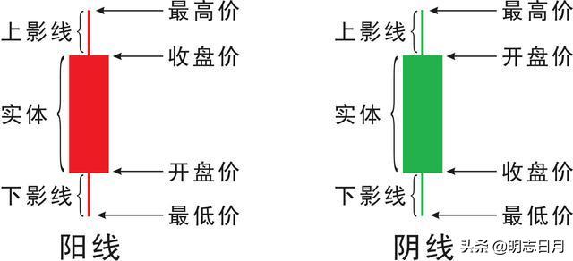 一根K线由开盘价、收盘价、最高价、最低价四个部分构成。其中收盘价高于开盘价的为阳K线,用红色填充表示该周期内股价是上涨的;而收盘价低于开盘价的则为阴K线,用蓝色或者绿色填充表示该周期内股价是下跌的。