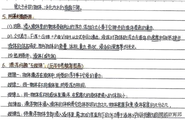 4、原理法,这个是考试的重点,不仅考计算,还考浮力与哪些因素有关,所以一定要弄清实验是怎么做的,公式是怎么推导的,另外这个方法还经常与二力平衡法联系在一起出题,所以要认真对待。F浮=G排=ρ液gV排。对公式中的每个字母表示的含义一定要弄清。