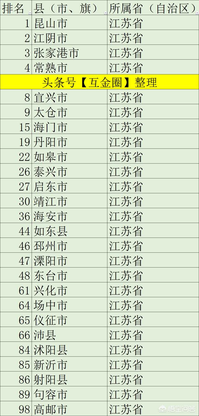江苏省作为全国第二大经济地区,GDP常年排在全国第2;旗下有13个地级市,13个地级市中有3个全国万亿成员,分别是苏州、无锡、南京。13个地级市GDP全国排名全国前100,是全国唯一可以做到的省份/自治区。所以有全国最多的26个百强县是实至名归。26个上榜的百强县包揽全国前四,分别是排名第1的昆山、排名第2的江阴市、排名第3的张家港市和排名第4的常熟市。26个百强县分布在苏州、无锡、常州、南通、泰州、徐州、宿迁、扬州、盐城。