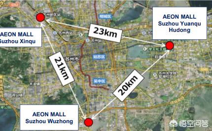 店和店之间也是有距离规定的,比如苏州的永旺分布是这样的:
