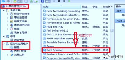 4,点击后会进入到计算机管理界面,在左边依次点击【计算机管理】—>【服务和应用程序】—>【服务】,接着在右边找到【print spooler 】并用鼠标双击。