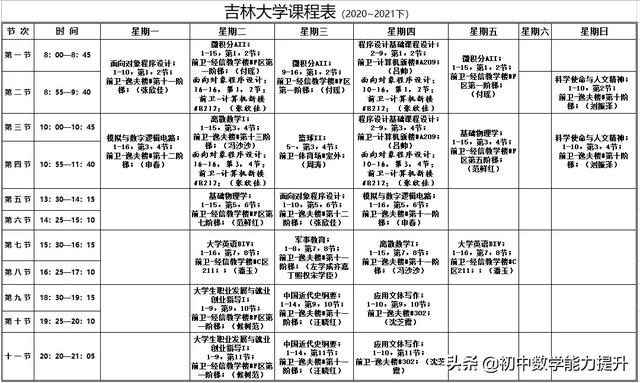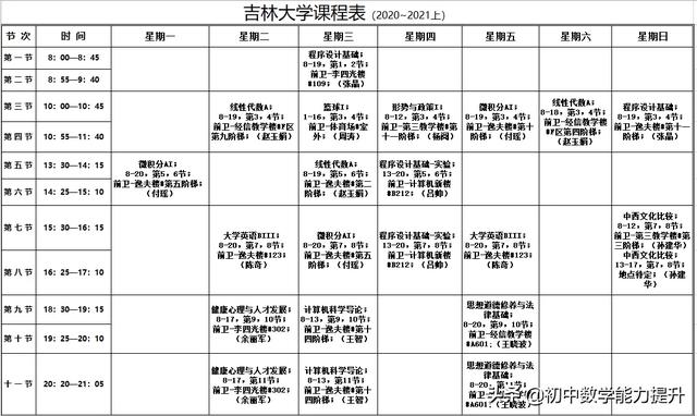 我家孩子2020年被吉林大学计算机专业录取,在吉林大学学习的这段时间,接触到众多同学,感觉到同学里面牛人非常多。吉大课程安排非常紧,要求高,总体感觉就是低调务实。比如所学数学课程,要求和数学学院一样,都是A级。今年放寒假,和同学聚会,和他高中同学所读的大学进行了比较,比其他大多数同学的大学课程都要繁重,这些同学就读于哈尔滨工业大学,浙江大学,大连理工大学,东北大学,天津大学等。请看上学期和下学期的课程表。